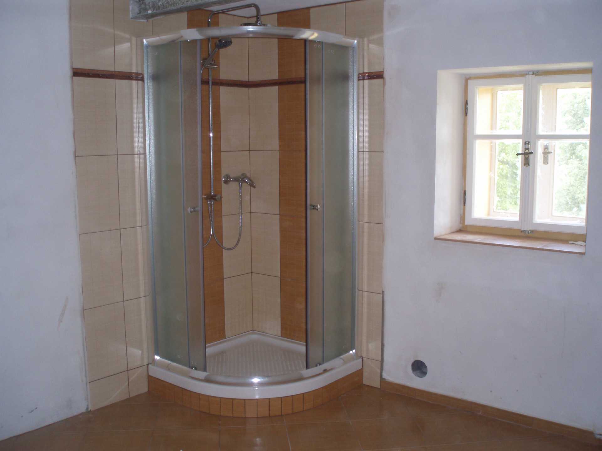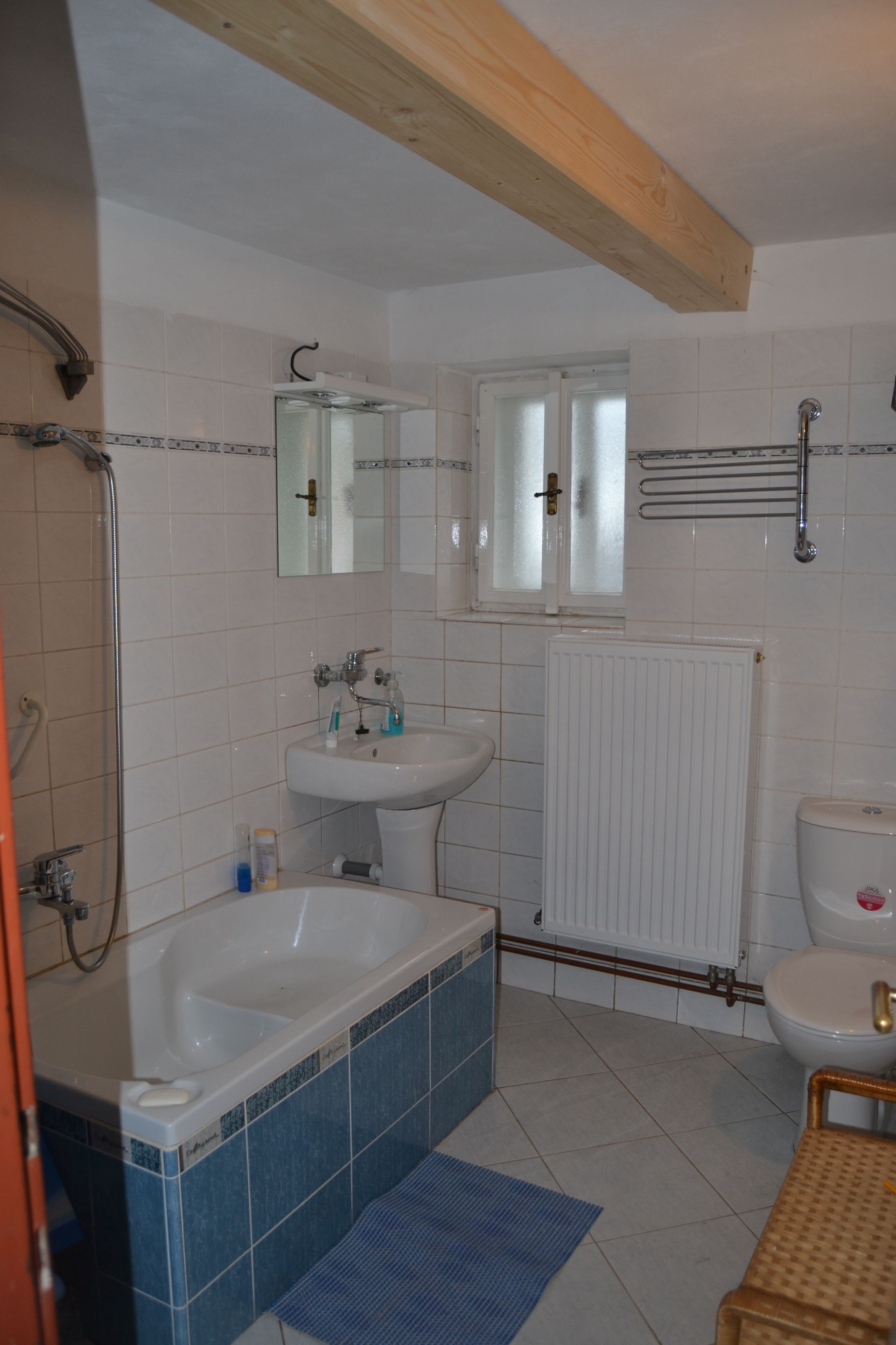 Koupelna s vanou, sprchou, umývadlem a záchodem, odděleně se nachází druhá sprcha, která tvoří příslušenství sauny.